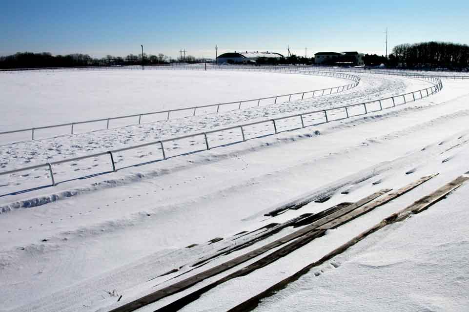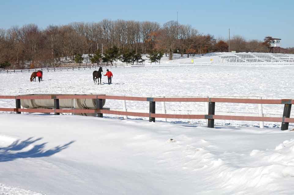サラブレッドが少しでも歩き安く、また採餌をとトラクターで一定幅を除雪