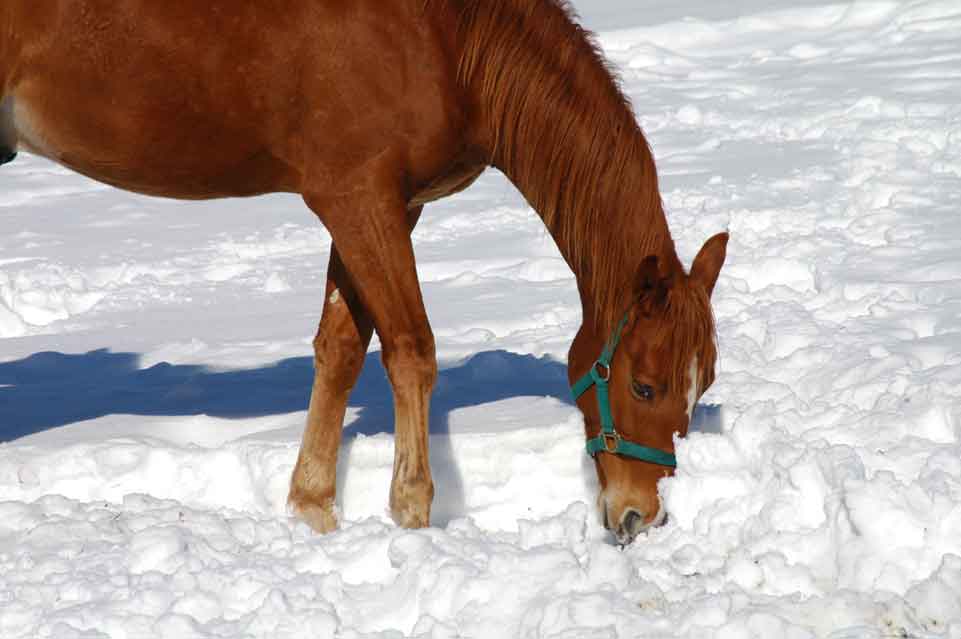 真歌地区も積雪が多く、写真のように細長いサラブレッドの顔も半分は雪の中