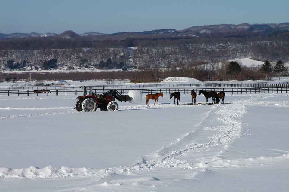 採餌が困難であるのを解消するため、トラクターで乾燥牧草を運搬ししサラブレッドに与える