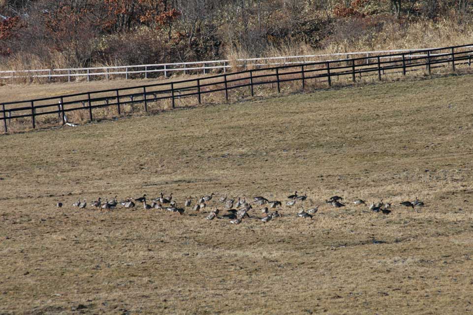 ようやく静内に姿を現したマガンの第一団、今年は暖冬で降雪もほとんどない