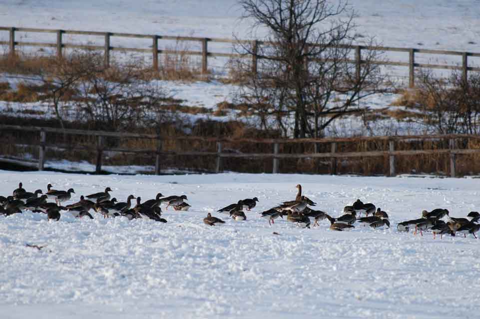 積雪なので、マガンたちは雪に、はいつくばって採食をしていた。