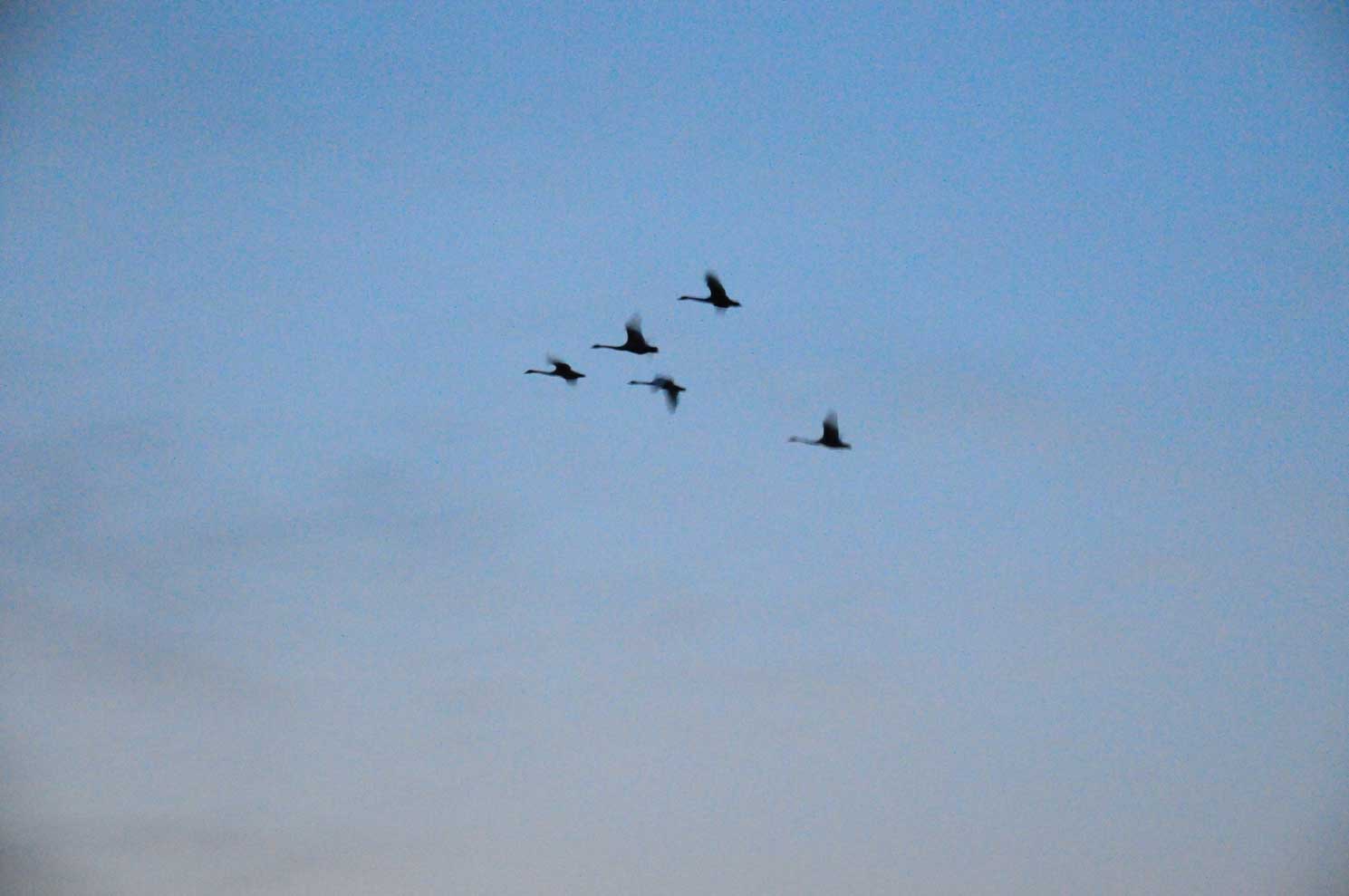 夕暮れ時、ようやく現れたと喜んだのもつかの間、マガンではなくオオハクチョウのファミリーだった