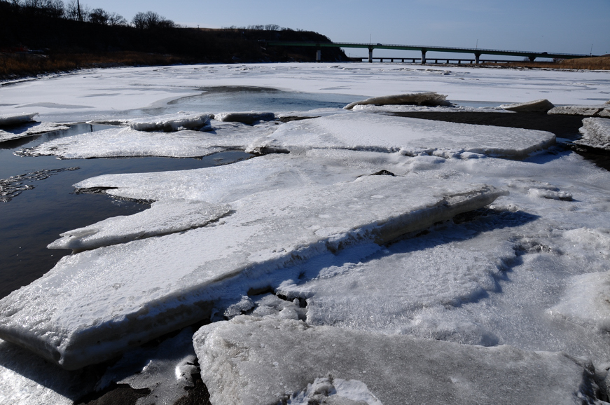 10:35〜厚別川も、暖気で川の氷がかなり溶けて来た。