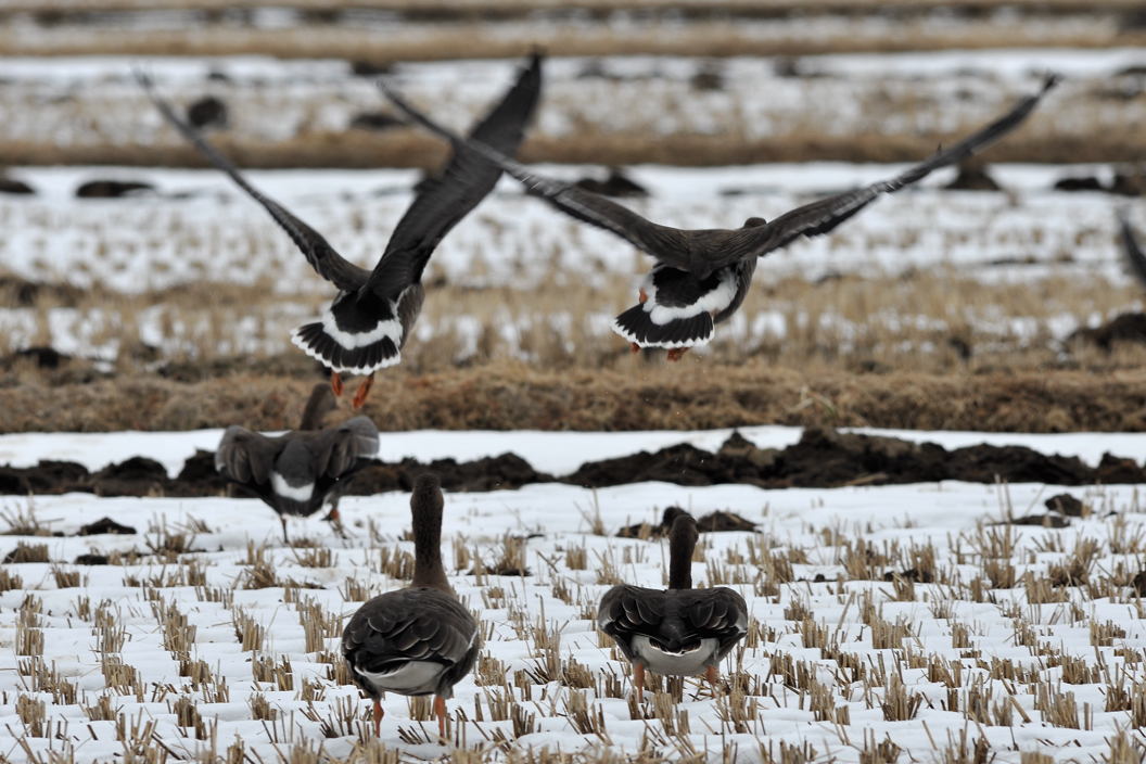 これまでの経緯で新ひだか町静内で越冬を終了したマガンは、その後、むかわ町へと移動する
