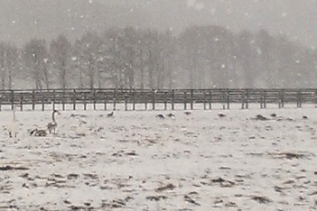 ●1月9日 雪 8:48〜新冠町、高江地区、M宅上空を15〜16羽のマガン飛ぶのをMさんが確認したと電話で情報提供あり。