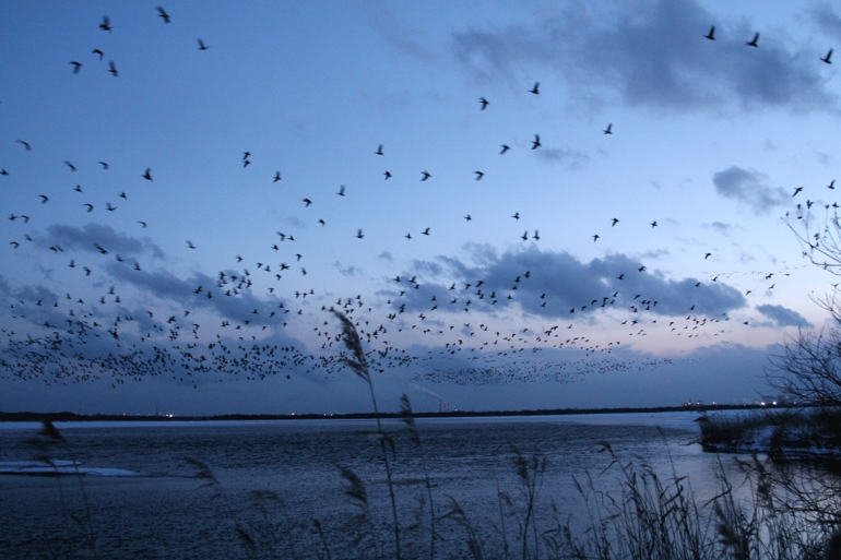 ねぐら入りのため美々川河口域上空よりウトナイ湖へと入る群れ
