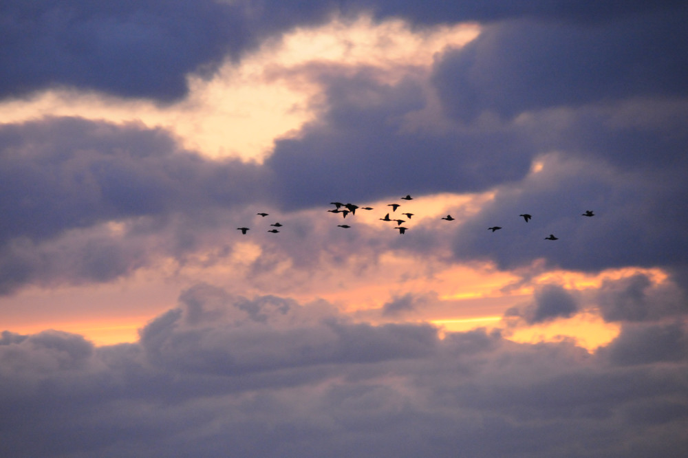 15:51~鵡川河口(右岸)にて、畑から海側へ飛び出し着た時と同じルートで弁天沼方面へ飛び去るマガンの群を確