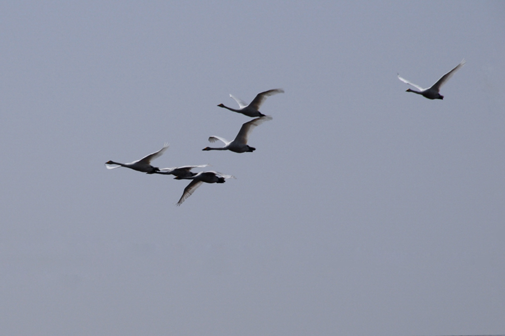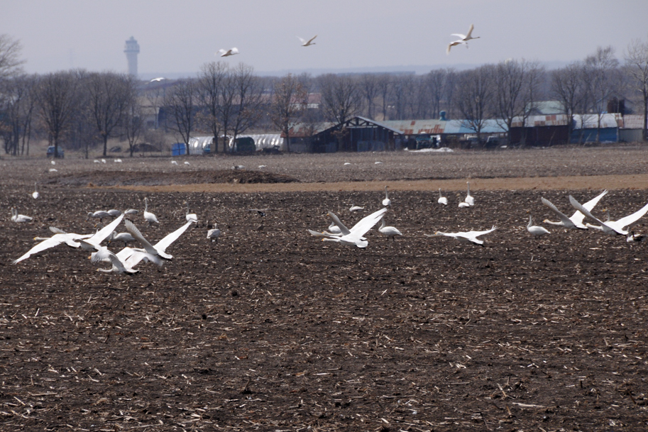 飛翔するオオハクチョウ、無事にシベリアへと皆が祈る 観察で驚いたのか、手前から次々と上空へと上昇するオオハクチョウ この地は、その日によっては、オオハクチョウよりもマガン、ヒシクイの個体数が多い場合もある 残雪に集まるのは、ここで雪解け水を飲むため トウモロコシ畑は採食地、牧草地は休息地と使い分けしていることにお気づきですか?