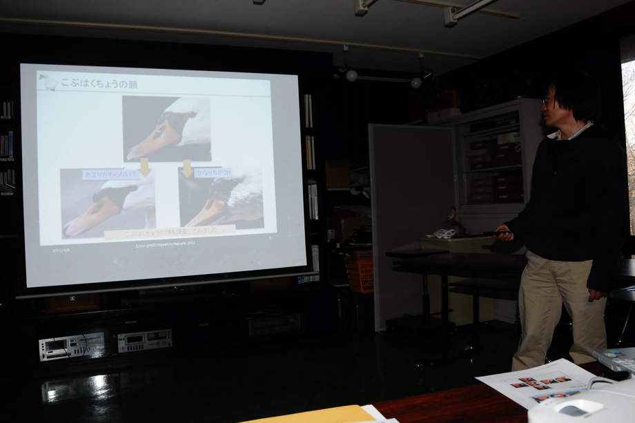 初参加の中田さんが長年の研究成果を発表。膨大なデータからなるリポートは異彩を放ち、存在感が 全国各地のコブハクチョウ顔面を撮影した労力は相当のもの、執念?を感じる コブの形状にも色々なパターンが。写真も全てが綺麗で鮮明 ウトナイ湖で繁殖しているオオハクチョウの生態を地元苫小牧市の村上さんがリポート 繁殖したオオオハクチョウ親子、雛は4羽 北海道でオオハクチョウが繁殖するのは興味深い話