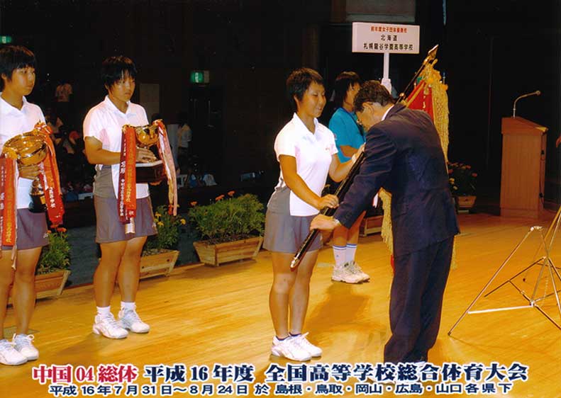 谷岡キャプテンから朝倉大会委員長へ優勝旗が