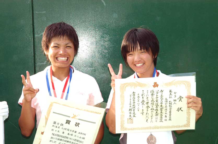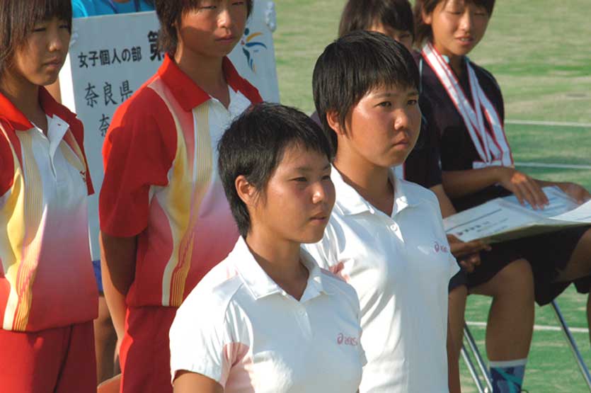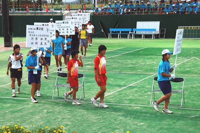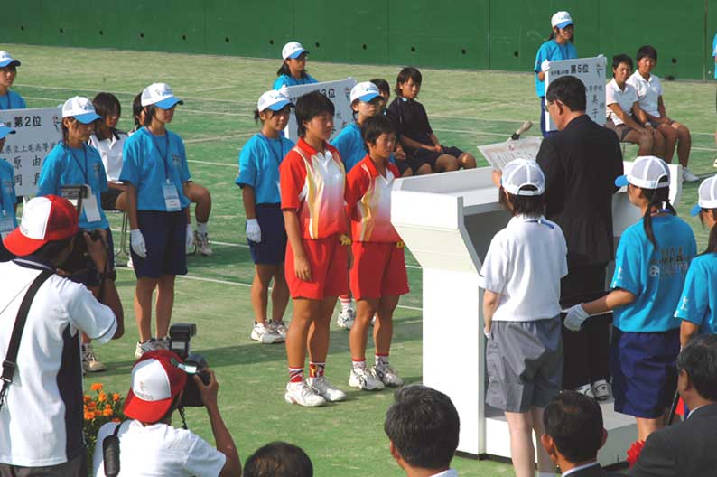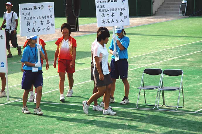 優勝チームを先頭に入場 札幌龍谷学園も谷岡・渡辺、佐々木・高塚と二ペアが8に入った 上尾高校待井・大森は8に入り終始笑顔 女子個人戦ベスト8に輝く左から佐々木、高塚 個人戦でベスト8に入賞したが表彰式ではけして笑わなかった谷岡。個人戦はともかく団体戦での惜敗が脳裏をよぎっているのか 個人戦優勝の上原・工藤(上尾高校)
