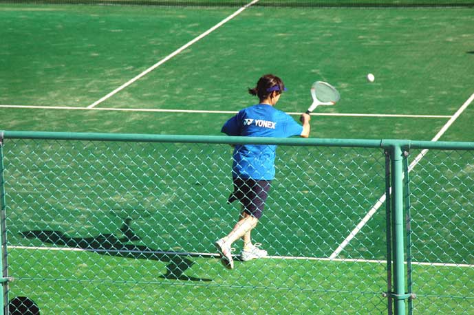 古巣のヨネックスのシャツで早朝から選手の調整をしてくれる諏訪コーチ、蔭の立役者でこの人がいなければV2はなかった