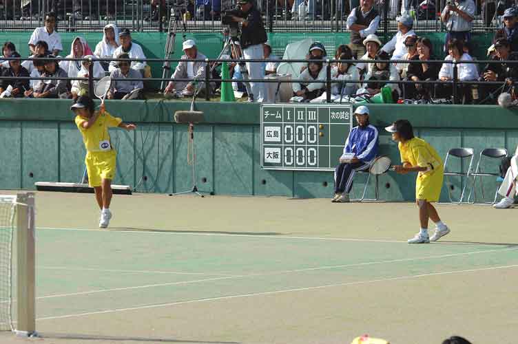 第一試合は第一、第二ゲームとも広島がリード、写真は大阪のサーブ