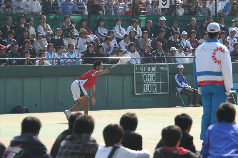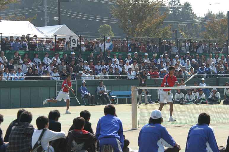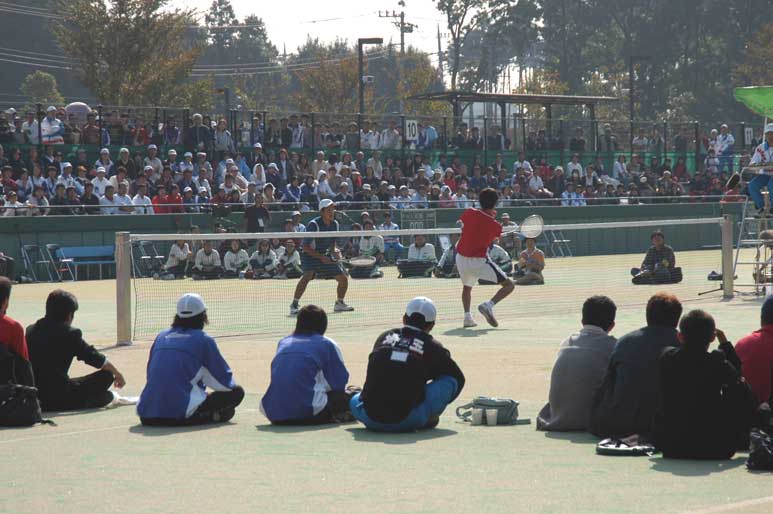決勝戦はなんと言っても選ばれた二チームだけの晴れの舞台、どちらのチームも輝いていた ポイント毎に気勢を上げる宮城応援団 落ち着いたプレーと安定したストローク、宮城・水間 決勝戦ともなれば会場も一段とボルテージが上がる このペアでインターハイも決めるなど勝負強さは天下一品