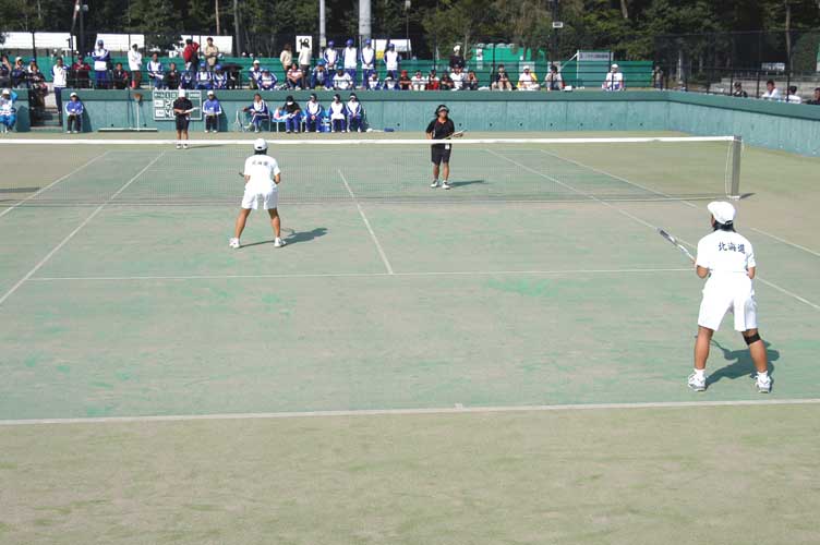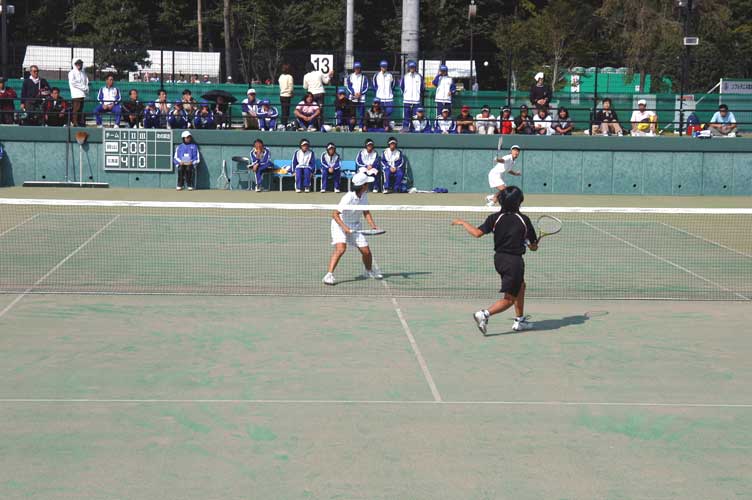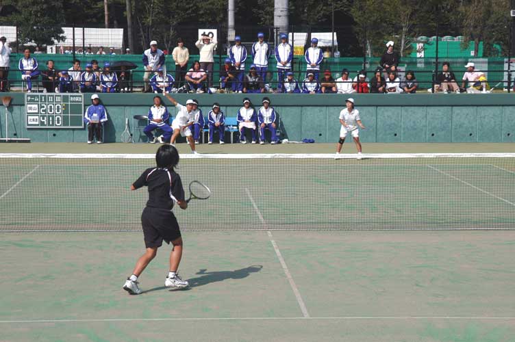 後衛・谷岡、小野のストローク合戦。前衛・渡辺、梶谷