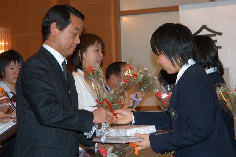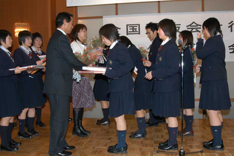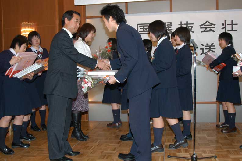 谷岡から監督へ 続々と選手から贈り物が 淡々と受け取る藤堂監督、大きなジェスチャーは諏訪コーチと対象的な二人 良く頑張ったと監督と渡辺がガッチリと男の握手