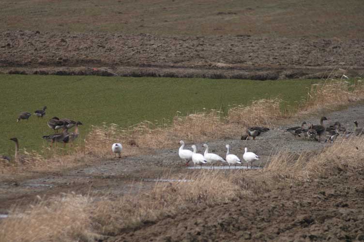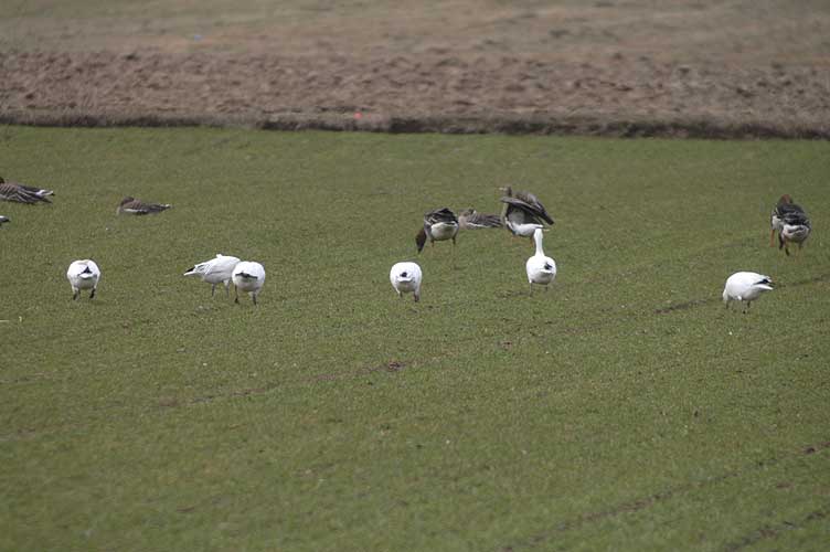 ようやくカメラに収まった6羽のハクガン この日の観察では、5羽と1羽は別行動と同一行動の繰り返し 一番右側が幼鳥、そして残りは全て成鳥と思われる 仲良く一列に並んで水を飲みに出かけるハクガンの群れ 尾羽を撮ろうとハイ、パチリ 無事に北極海へと移動出来ることを念じ別れた