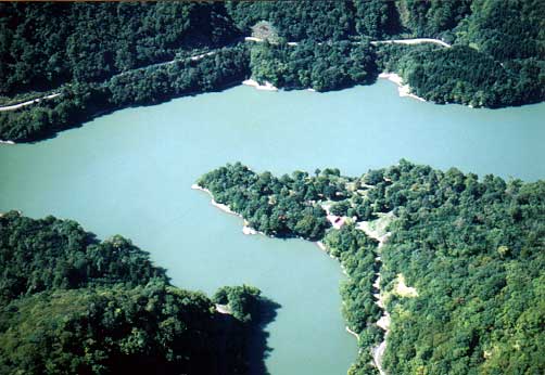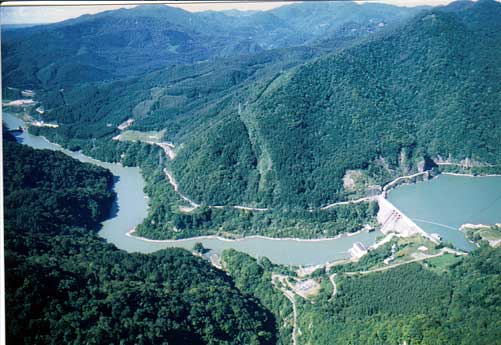 双川地区。中央は双川ダム(最大出力6,000KW・昭和54年建設) 静内ダム(最大出力22,500KW・昭和54年建設)と静内湖。上方は日高山脈 静内ダム(三石より新冠方向) 静内湖キャンプ場
