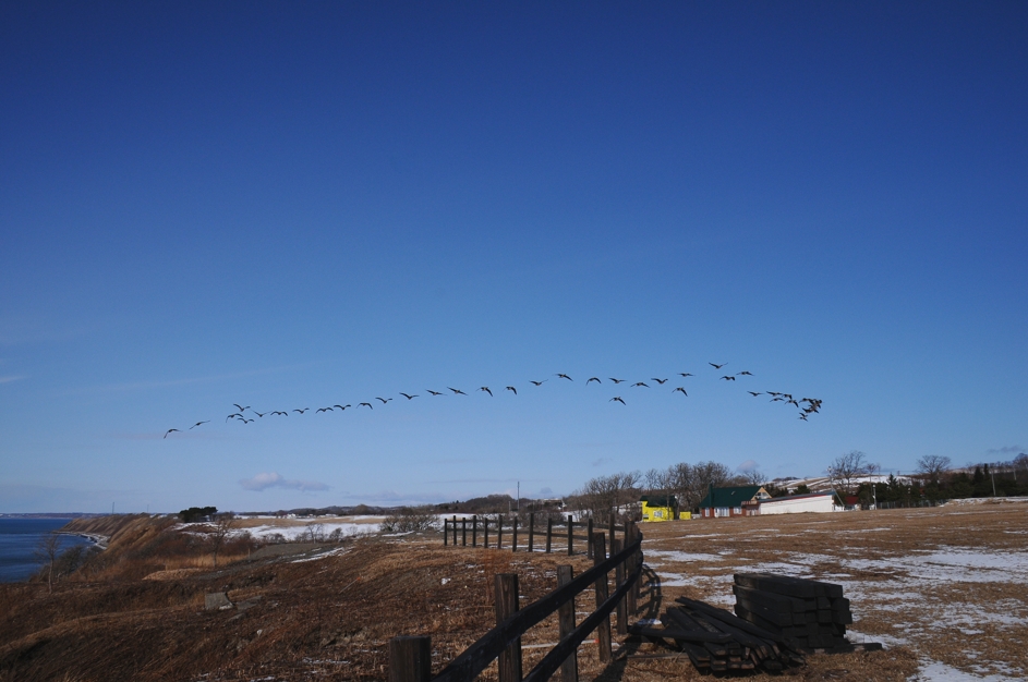 1.16 新冠町大狩部、カフェ・椿、広場前を海岸より陸路へと針路を変え飛翔するマガン48羽 (たまたま太平洋を撮影中、偶然、目の前にマガンが現れた、今季二度目のラッキーショット