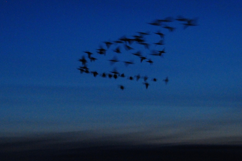 1.21、PM17:08、新冠町大狩部牧場より東方向にねぐらへと向かうマガン群れ