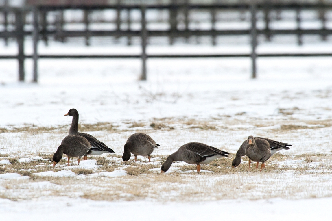 1.22、PM16:10、浦河町東幌別地区で採食するマガン6羽、この時期に居ることは越冬を意味する (浦河町・川村氏提供)