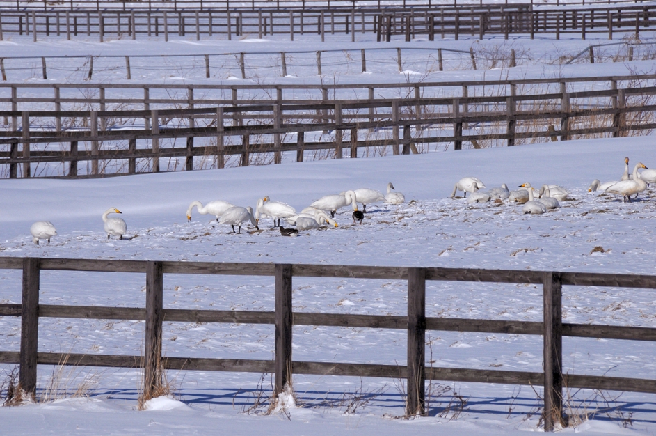 1.25、新冠町大狩部で採食するマガン48羽。昨晩より15pの降雪となるが、日中プラス気温で何とか採食は可能