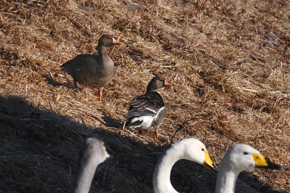 1.27、様似町、JR日高線鉄橋下、様似川河口域でオオハクチョウと一緒に採食するマガン2羽(成鳥1羽・幼鳥1羽)