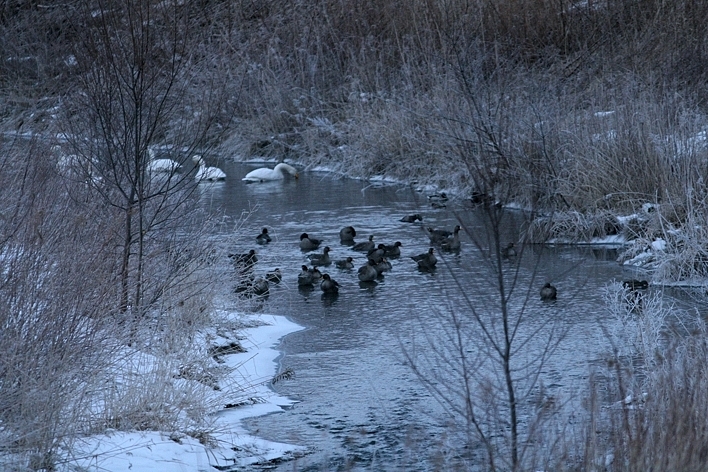 1.19、AM7:15、日高町富川東地区、沙流川支流オコタン川でマガンねぐら発見、カモと一緒に数羽が確認できる