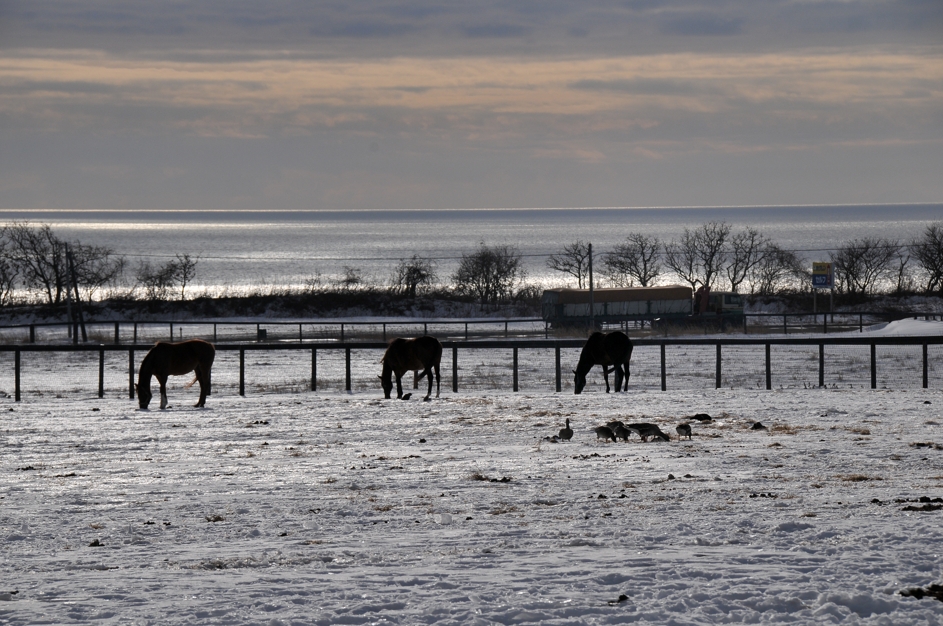 1.31 新冠町大狩部、この日は午後よりここで採食開始、国道235号線に近く、車両が頻繁に往来する