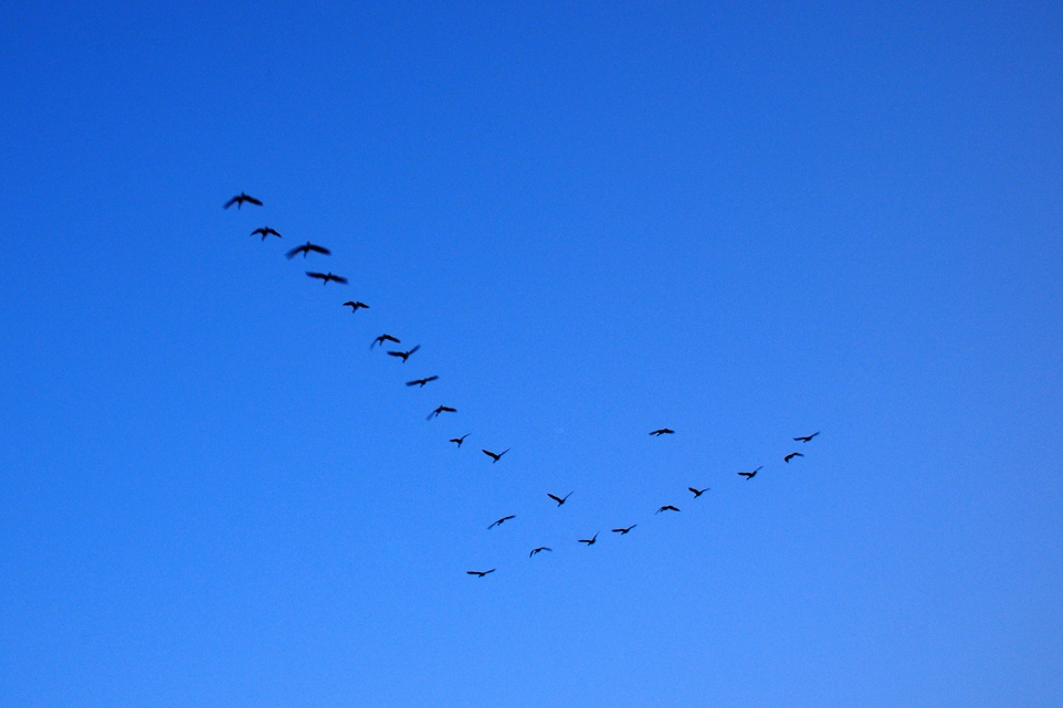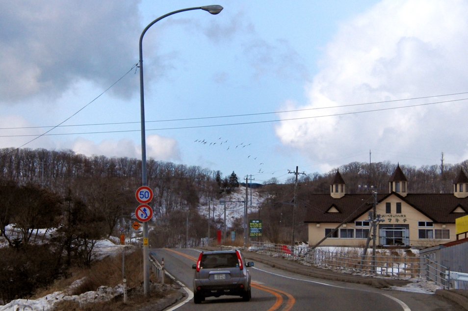 2.16/16:50、、太平洋より侵入、海路から陸路へと針路を変え、カフェ椿上空を新冠町方向へと飛翔するマガン23羽 (大狩部地区上空