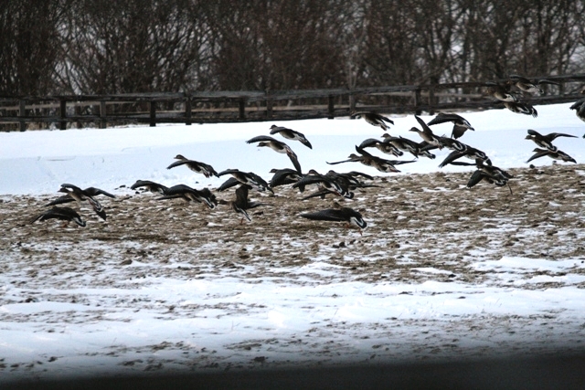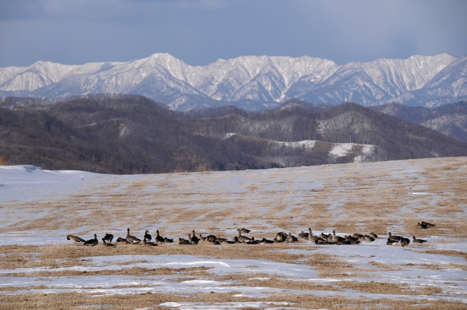 2.7 今シーズン初めて日高町沙流川流域で越冬しているマガン群れ28羽(マガン27羽+ヒシクイ1羽)、今後、越冬地北上の先駆け象徴か
