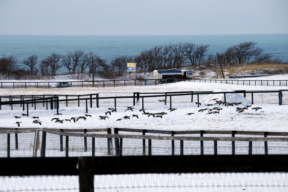 2.25/15:38、国道235号線縁の大狩部牧場で採食するマガン