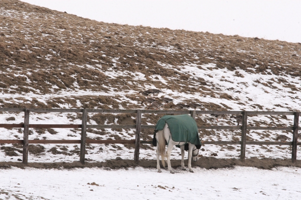 15:30〜新冠町高江、隆栄牧場に約30羽程度のマガンが牧草地で採食しているのをT氏の奥さんが確認。写真を撮ろ