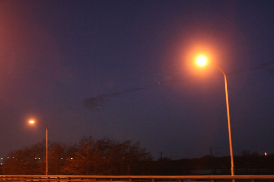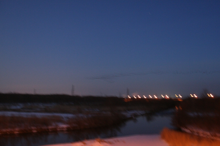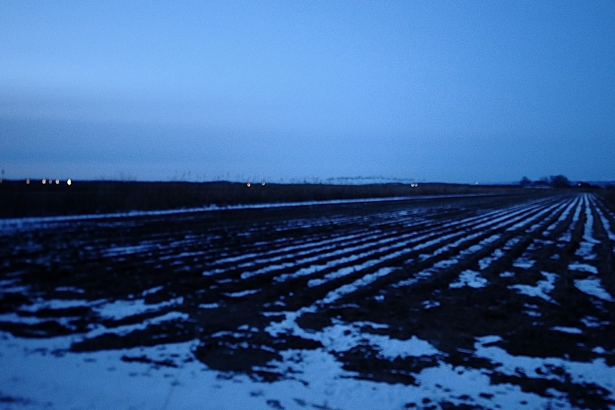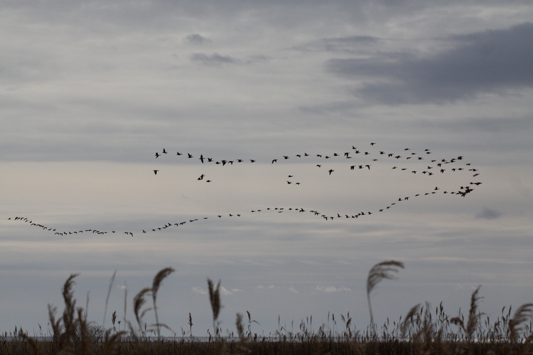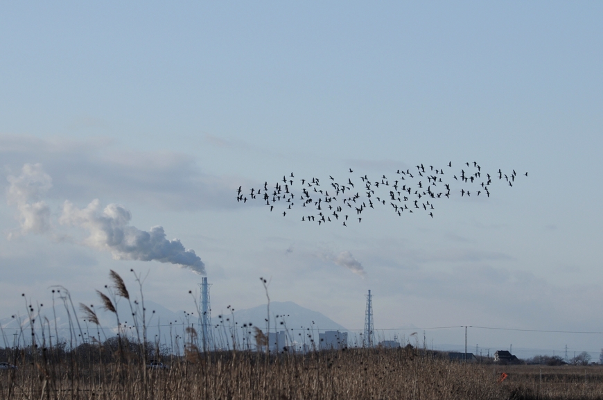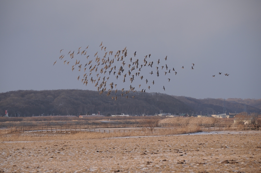 2月8日午後5時23分、厚真町浜厚真の黒豆畑より、地上すれすれの低飛行でねぐらのウトナイ湖へと飛び出すマガン群れ