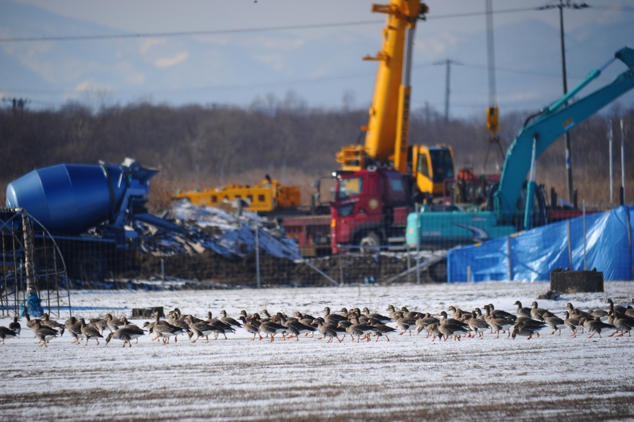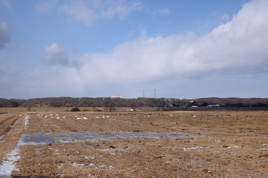 2月18日、発達した低気圧の通過で数日前に降雪があった。強風が吹き荒れる日高町富浜地区。この日マガンはどこでも確認できず