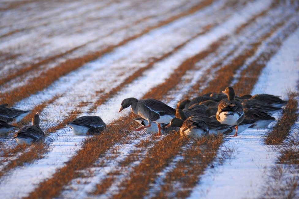 2月6日、夕陽が染まる中むかわ町で採食するマガン、個体数計は206羽+4羽で210羽と変化なし