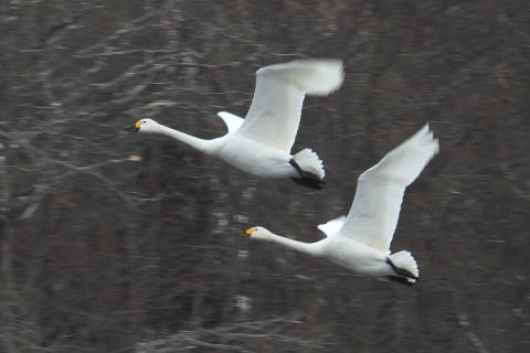 北上川新堤のコハクチョウ (征矢和宣) 飛翔するコハクチョウ (征矢和宣)
