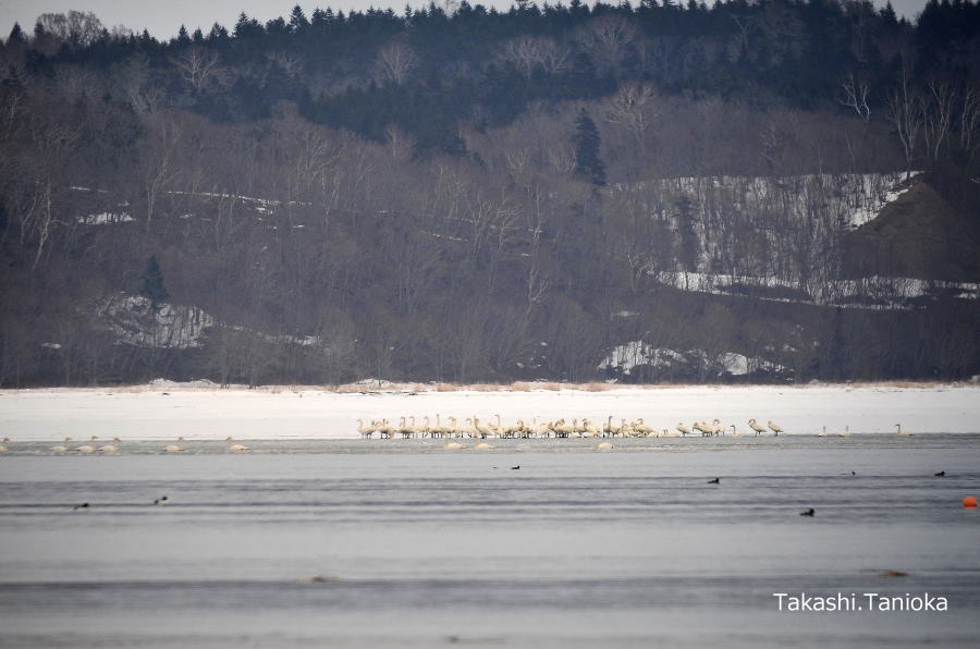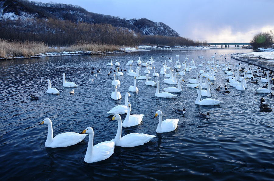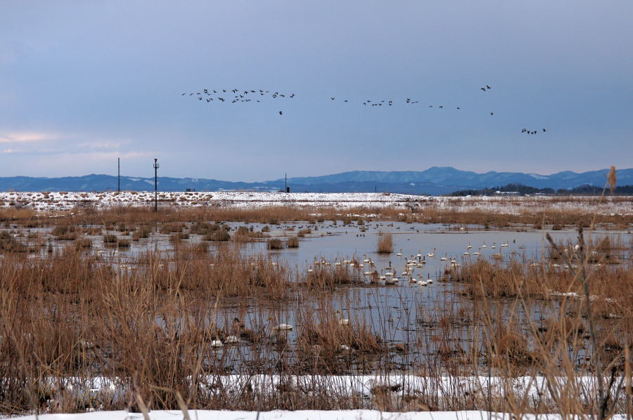 オオハクチョウ、コハクチョウ、アメリカコハクチョウの3種類が越冬、特にアメリカコハクチョウは個体数も多く有名