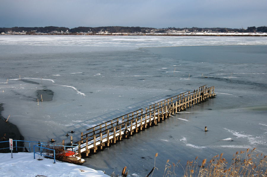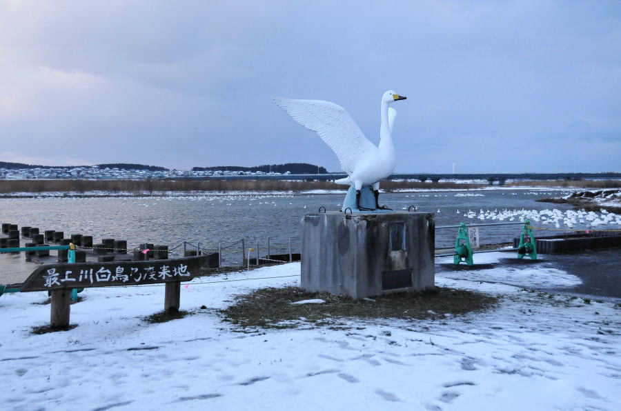 大河最上川の広い河口域でオオハクチョウ、コハクチョウの両方、合わせて約一万羽が越冬する