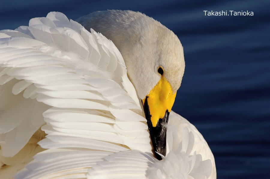 羽繕いをするオオハクチョウ、越冬するためには羽根の手入れは欠かせない