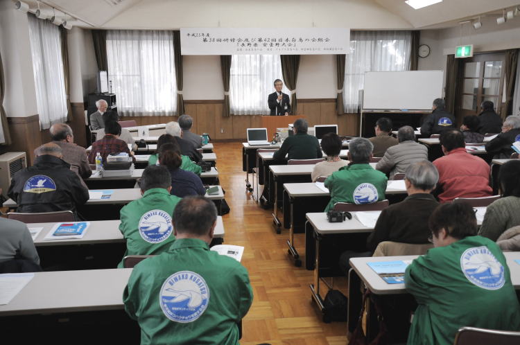 2014年3月1~2日、長野県安曇野市で開催された平成25年度第42回総会、 第38回研修会の様子をご紹介します。 開催地元では1年間、心を込めて準備をしますが、会員はハクチョウを通じた 様々な出会いを求め全国から集まります。 大会中、とてもアットホームな空気が流れる中、ハクチョウを愛する心優しき仲 間たちが、ハクチョウ情報、苦労話、研究成果などで交流、交友を温めます。 参加者全員で記念撮影 藤巻会長の挨拶 地元安曇野市長が歓迎の挨拶 総会風景 研修会終了後、一同が会して懇親会