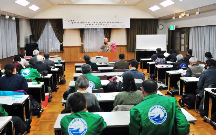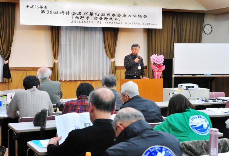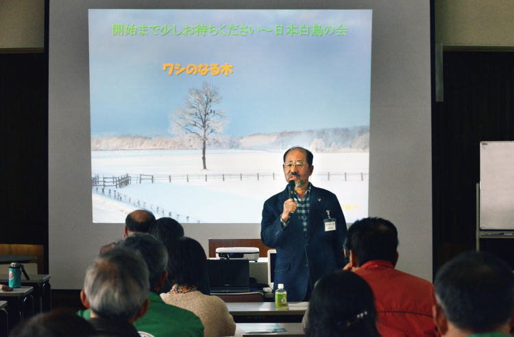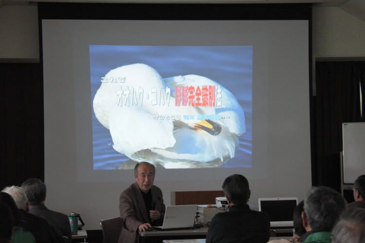 最後は会田副会長が、長年の保護活動「白鳥が結ぶ人の輪、心の輪、安曇野白鳥渡来30年の記録」を熱く語った