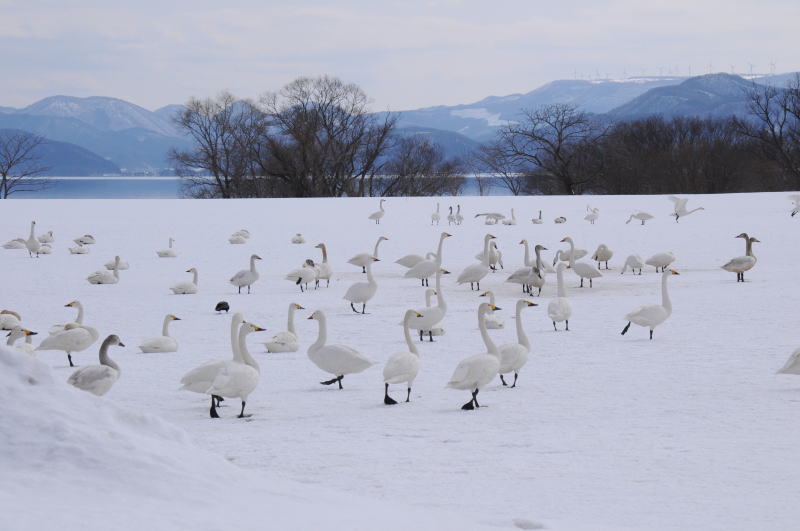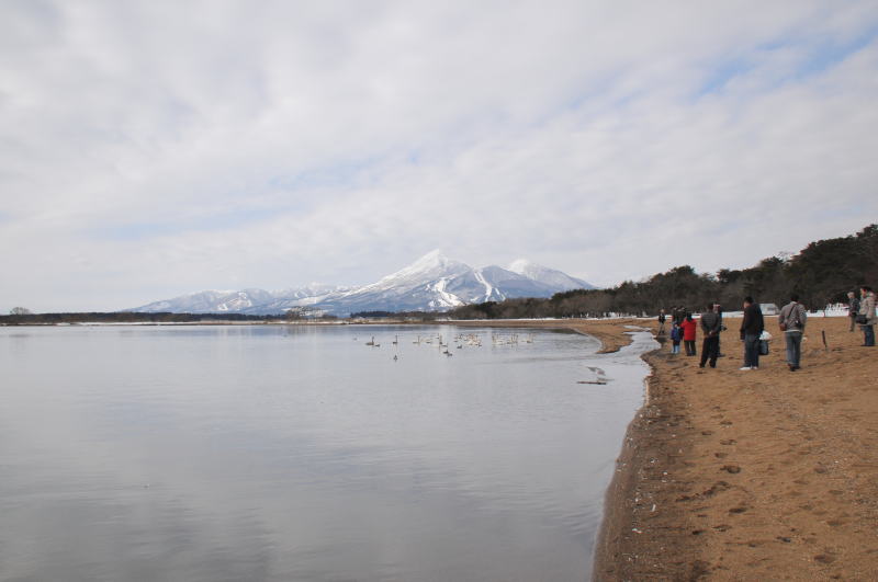 猪苗代湖と言えば唄にも歌われている名峰・磐梯山、この日は珍しく顔を見せ会員を歓迎 案内役は、永年地元でハクチョウ保護活動をしている鬼多見賢会員 磐梯山をバックに猪苗代湖畔のコハクチョウ 猪苗代湖を背景に畑で採食するコハクチョウとオオハクチョウ 昼食は、独特の風味の手打ち蕎麦。これを食べて解散、来年また元気でお会いしましょう