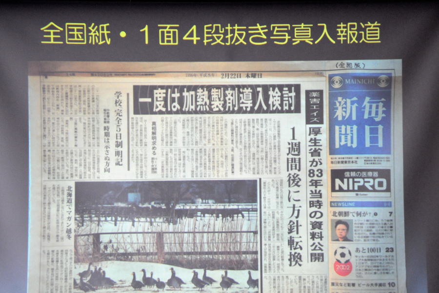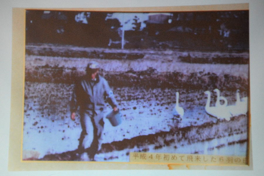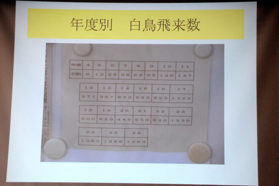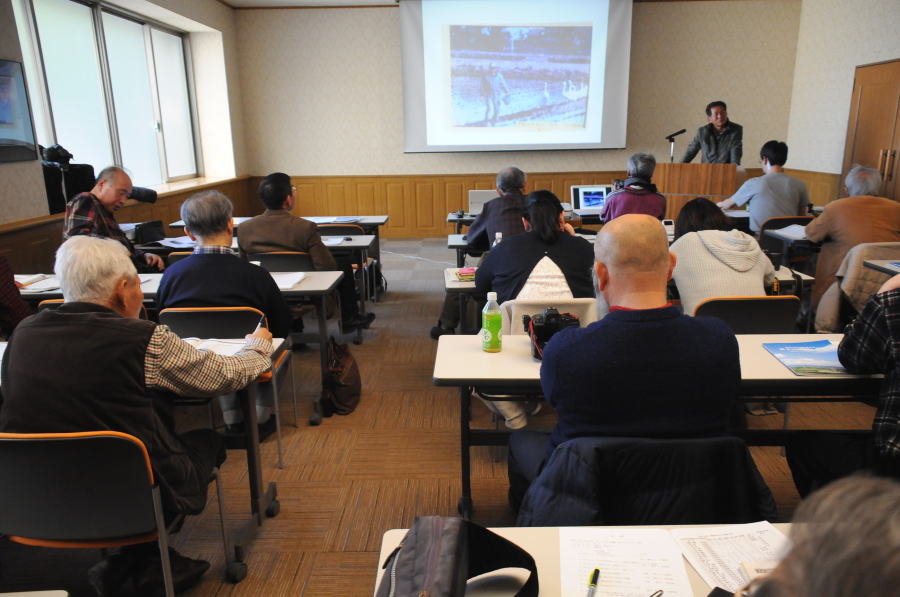 ⑴.本埜村の白鳥について~出山 輝夫(千葉県) 研究発表会場 出山会長さん自らが会設立から現在までを紹介 平成4年飛来した6羽のハクチョウが会設立のきっかけ 年々渡来数も増加している ⑵.天然記念物マガン 北海道初越冬から20年の軌跡 ~谷岡 隆(北海道) 1995年12月以降、観察、保護を続けて昨シーズンまで20年の軌跡を紹介 マガン初越冬を毎日新聞が全国版1面で報道