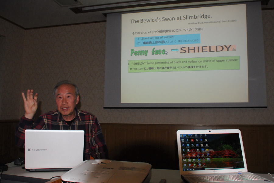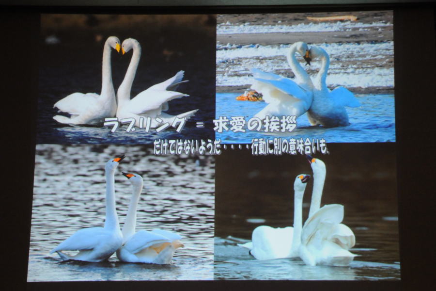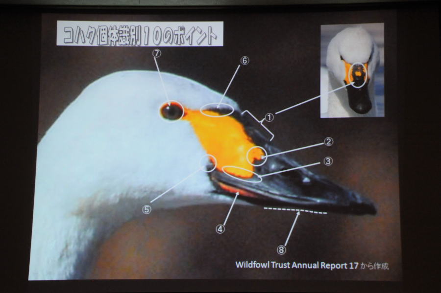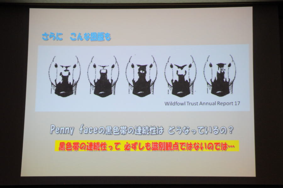 ⑺.白鳥の生態を追う SWAN IN JAPAN Vol.9 ~角田 分(山形県) 最後は、日本白鳥の会ではお馴染み角田理事の発表 嘴パターンの一つペニーフェイスの色々 コハクチョウ識別ポイントの色々 2羽のハクチョウによるハート形行動には求愛だけではなく絆を再確認するなどの意味合いが