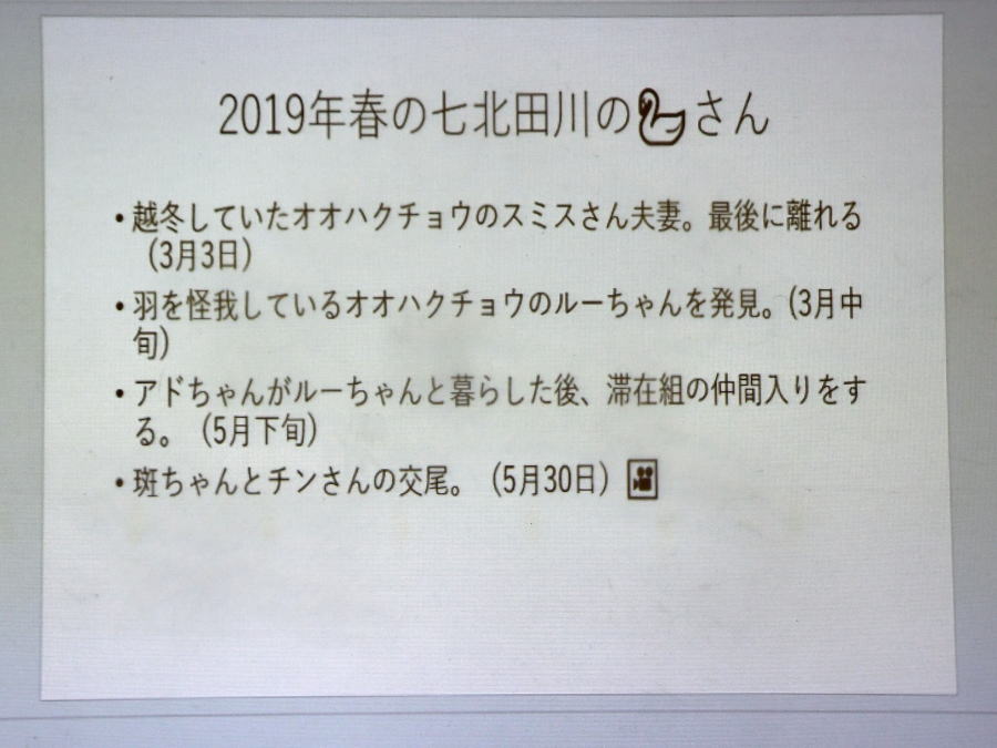 毎年1月に実施される全国一斉ガンカモ類調で、宮城県はオオハクチョウ多いとされていたが、 実際に調査してみるとコハクチョウの方が多かったという発表