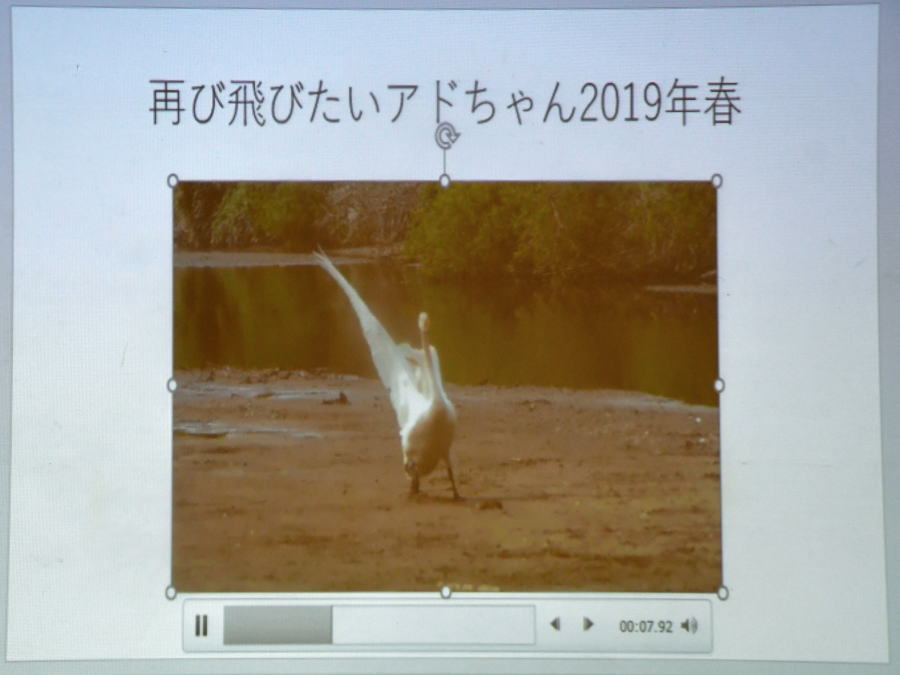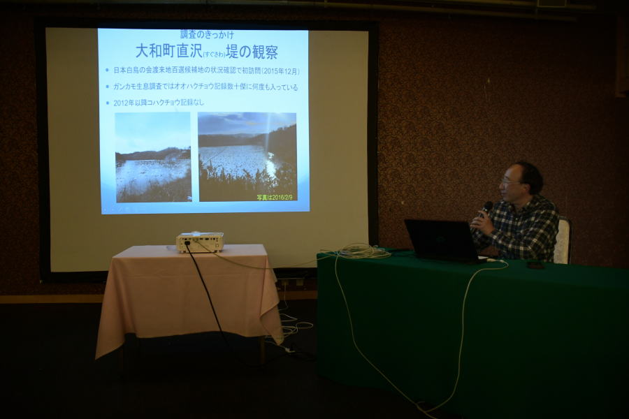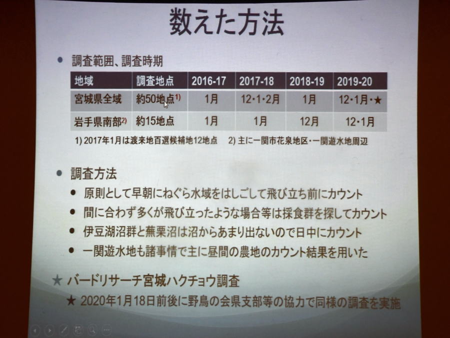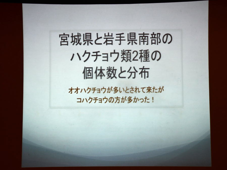 ⑶.非繁殖ハクチョウ類の換羽開始日に関する研究 ~佐々木 勝(宮城県) 宮城県仙台市、多賀城市を流れる七北田川でオオハクチョウを観察した佐々木さんの報告 発表者では紅一点の山崎さん、忙しい中で毎年発表しているのは立派 ⑷.宮城県と岩手県一関周辺における白鳥類の個体数と分布 ~平泉 秀樹(宮城県) 毎年1月に実施される全国一斉ガンカモ類調で、宮城県はオオハクチョウ多いとされていたが、 実際に調査してみるとコハクチョウの方が多かったという発表