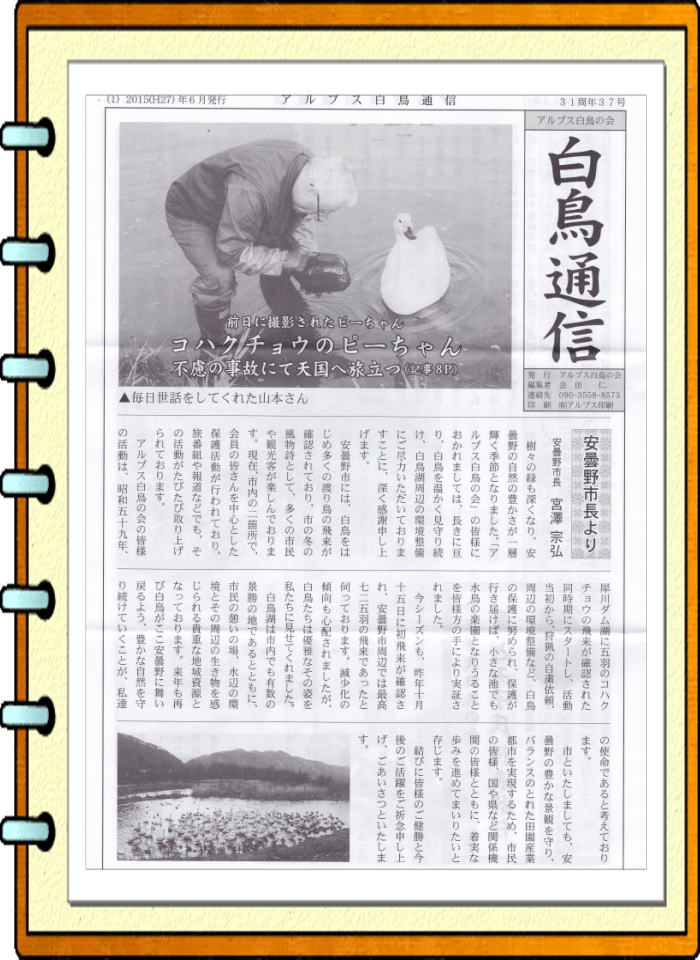 アルプス白鳥の会では、5月下旬、ピーちゃんと仲間の白鳥たちの慰霊碑を建立、弔っていますが、白鳥に対する愛