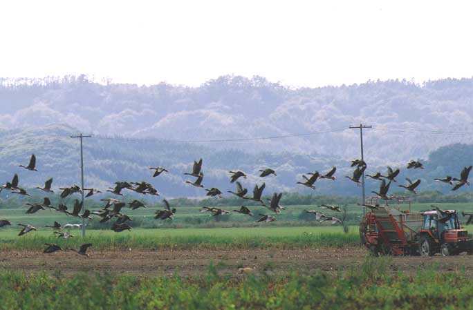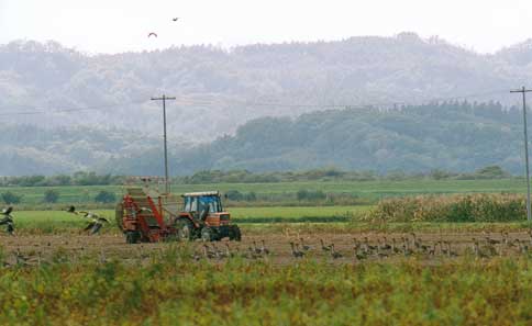 ジャガイモ収穫用のトラクターが近づき、一斉に飛び出そうとするオオヒシクイ