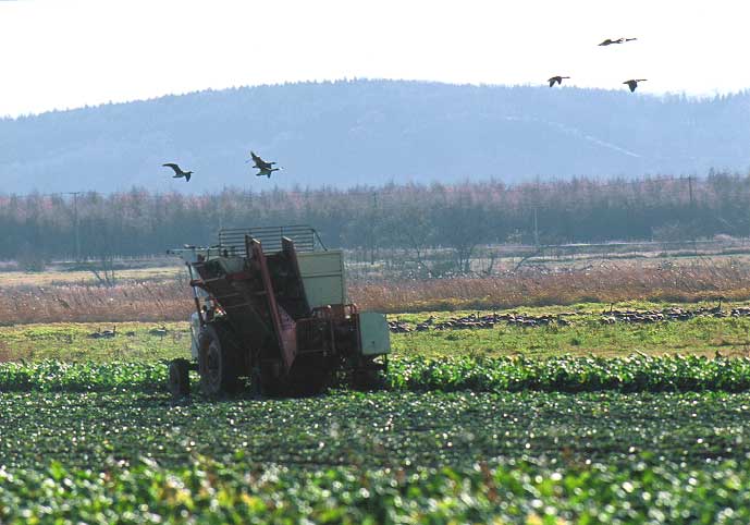 ビート収穫のトラクターが移動する中、悠然と採食を続けるオオヒシクイの群れ
